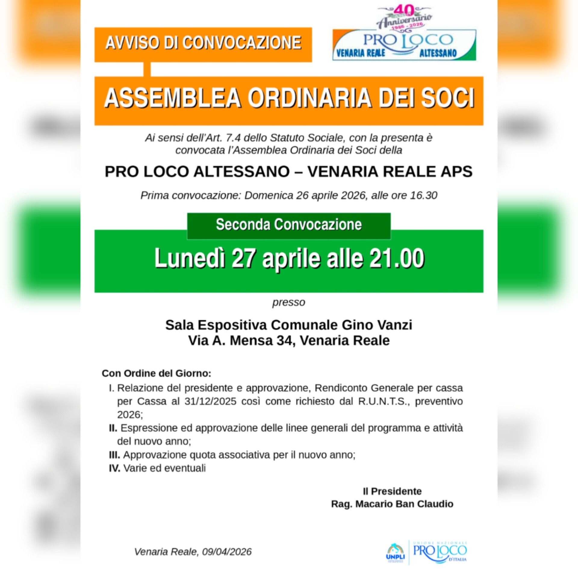 La Pro loco locale invita tutti i soci a partecipare alla consueta Assemblea annuale